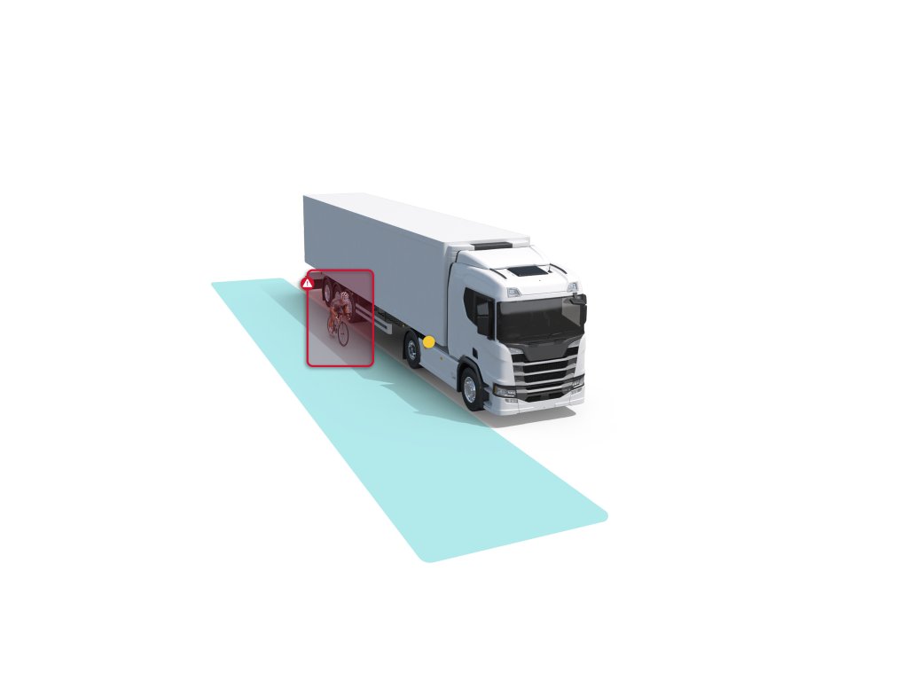 Tato jedinečná jednotka se dvěma radary je umístěna na boční straně vozidla a poskytuje kompletní pokrytí boku vozidla včetně přívěsu. Režim detekce přívěsu zjišťuje, zda je vozidlo vybaveno přívěsem, a zabraňuje kloubovému pohybu, který by mohl způsobit falešné výstrahy. Řidič je upozorněn, pokud do detekční zóny vjede cyklista, a v případě předpokládané kolize obdrží druhé varování.