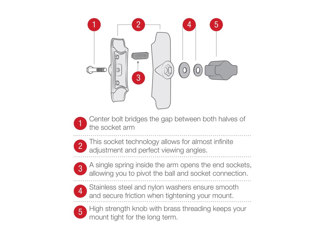 - Připevňuje se k jakémukoli kuličkovému komponentu RAM® velikosti B, včetně montážních základen a držáků zařízení; technologie dvojité patice umožňuje téměř neomezenou nastavitelnost montážního systému RAM®.