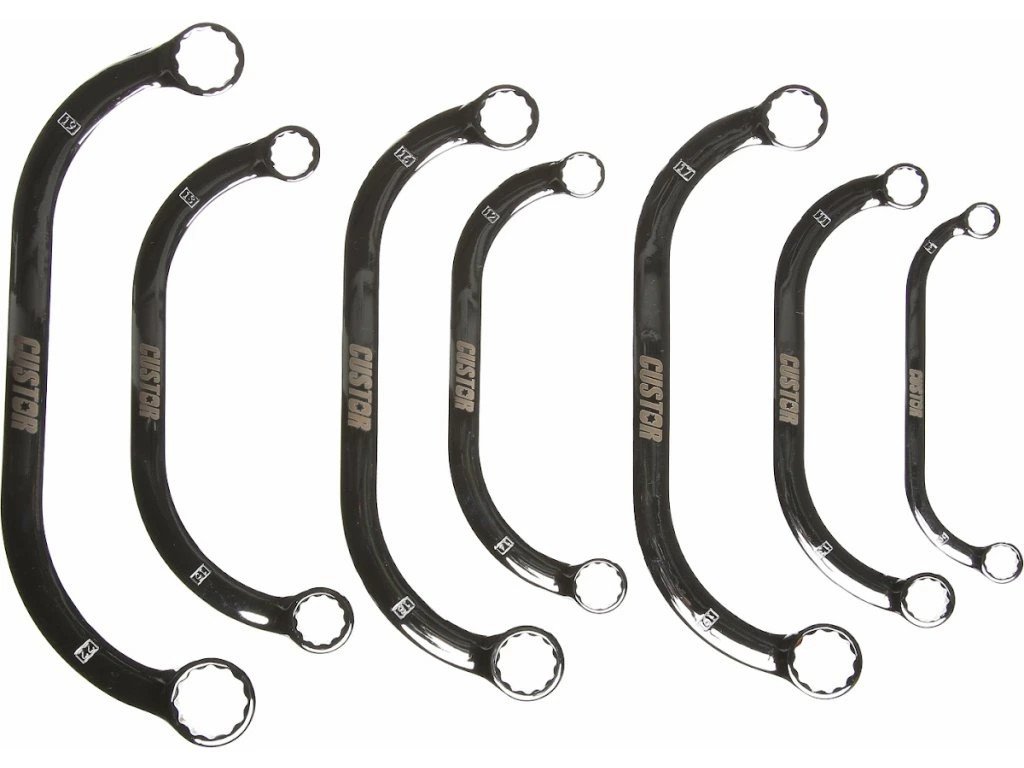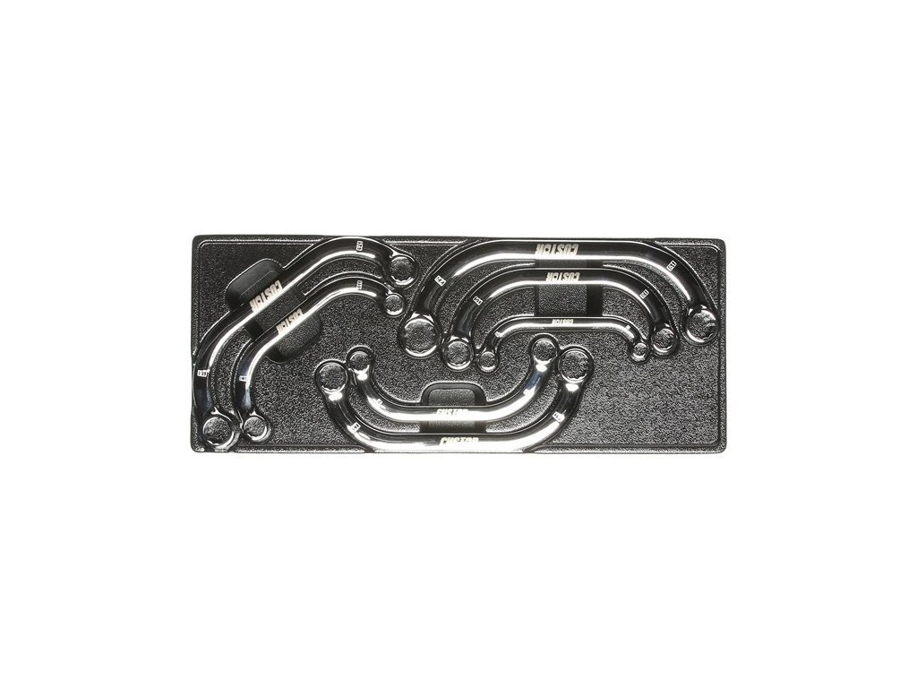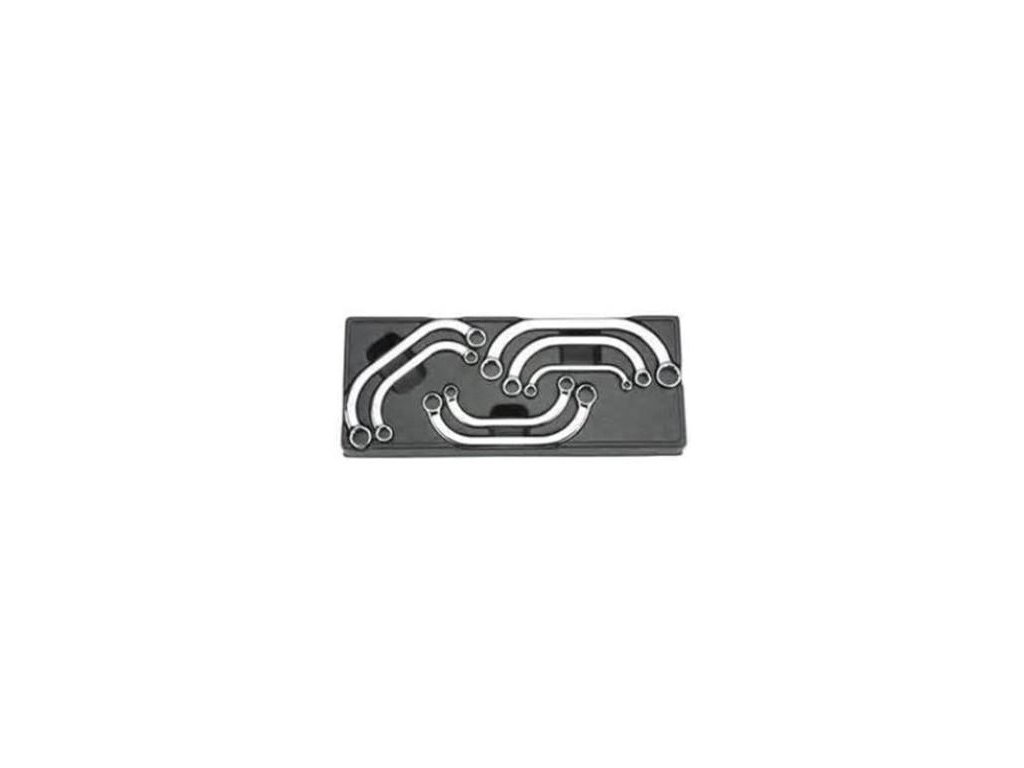 Sada obsahuje 7 ks očkových klíčů o rozměrech 8 × 10, 11 × 13, 12 × 14, 13 × 15, 16 × 18, 17 × 19, 19 × 22 mm. Materiál klíčů CrV.